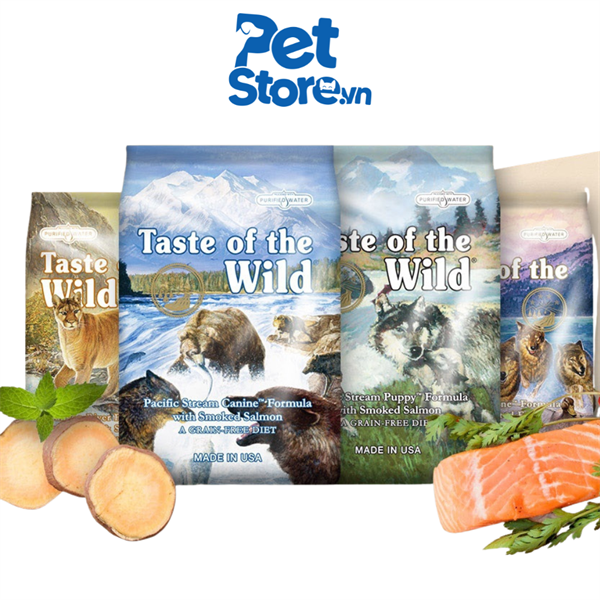 Taste of the Wild Puppy Pacific Stream mang đến hương vị cá hồi xông khói thơm dịu, đặc biệt phù hợp với chó con có da nhạy cảm hoặc hệ tiêu hóa yếu. Dòng này cung cấp omega-3 tự nhiên giúp da khỏe, lông bóng và hỗ trợ sự phát triển toàn diện của chó con.